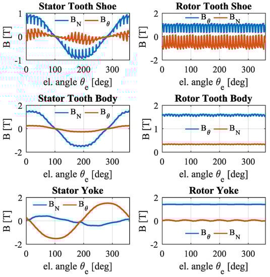 It can be noticed that the approximations in Figure 14b are good at least up to 1 , and a greater amplitude of the flux density variation, due the slot harmonics, is not expected in this motor, except for a current much greater than the rated one.