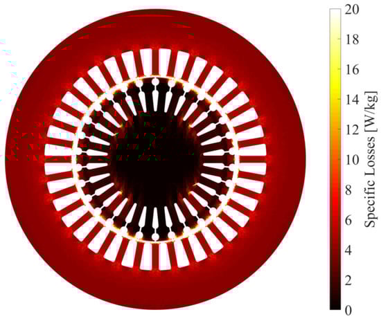 Thus, with flux density harmonics with such far values of frequency, it is not proper to consider only one couple of , coefficients for all the harmonics. The correct approach should be assigning to each harmonic a coherent couple of coefficient [15], interpolating the electrical steel datasheet with the closest frequencies to the considered one. The motor steel is a M400-50A, and the available specific iron losses datasheet includes the frequencies 50, 100, 200, 400, 1000, 2500 Hz.