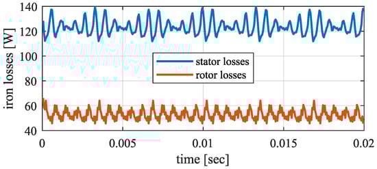The instantaneous values of the stator and rotor iron losses are reported in Figure 15. It can be noticed that, using this method, it is not necessary to simulate a complete electric period; actually, simulating only one stator slot pitch is sufficient to get the average value. Furthermore, the comparison between the two considered methods is reported in Table 5.