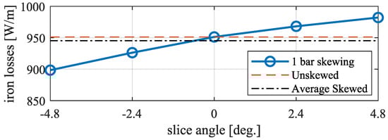 The skewing analysis in Section 5 can be coupled with iron losses computation, to get the variation of the specific losses with the slice angle. In Figure 16, it can be verified that in the skewed machine the iron losses are almost equal to the unskewed case.