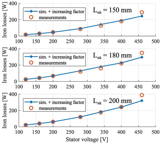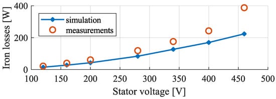 At first, the comparison between measurements and simulation results concerns only the motor considered in Section 6. The no-load test on the machine has been performed applying the stator voltages 30%, 40%, 50%, 70%, 85%, 100% and 115% of the rated value. Then, the iron losses are computed, following the procedure reported in the Standard for the AC machines’ efficiency evaluation. The first comparison result is reported in Figure 17.