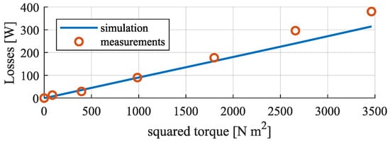 Even if the model takes carefully into account the role of the high frequency harmonics in the losses computation, the simulations do not fill very well the measurements. Possible reasons are related to the implemented losses model: in (23), represents the amplitude of the flux density harmonic, thus the model does not consider the presence of rotational fields [17,18], that occurs specially in the top of the stator teeth and in the stator and rotor tooth tips [19]. A further improvement can be obtained by summing the losses components, related to and , in each element.