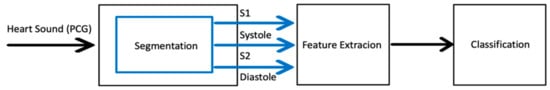 The general methodology of the automated heart sound classification algorithms consists of three steps. Those are segmentation, feature extraction, and classification steps (Figure 1). Segmentation is necessary for classification since most of the features used for classification are derived from fundamental heart sounds (FHSs) that occur because of the contraction and relaxation movements of the heart []. Even though there are some other lower-pitched sounds, FHSs usually include two distinct sounds, first (S1) and second (S2) heart sounds. The time-lapse between S1 and S2 is known as the diastolic period and the time lapse between S2 and S1 is known as the systolic period.