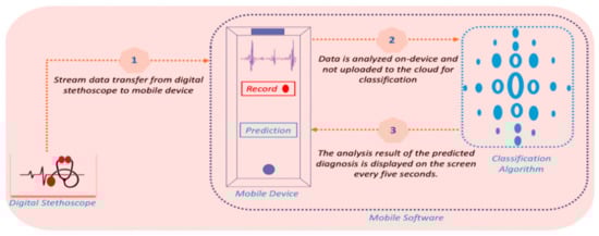 Workflow of the software. First, data is transferred from digital stethoscope to mobile device, then, the classification algorithm predicts the diagnosis, and the result is displayed simultaneously on the screen.