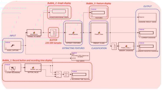 Software was developed in MATLAB by using the Simulink support package for mobile devices [,,,]. The support package has all the necessary blocks for using mobile devices’ sensors. Moreover, it is possible to use MATLAB functions and the trained algorithm within the projects’ block diagram. For using the trained algorithm, it should be converted to a C file beforehand, then it could be called back in the project. Generating C/C++ code from the trained algorithm can be done both by using the MATLAB Coder or by handcrafting the code [].
