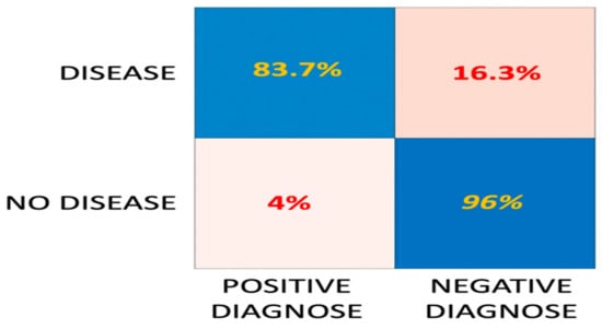 Classification accuracy performance and detailed classification metrics of the tested algorithms are presented in Appendix A (Table A1, Table A2, Table A3, Table A4, Table A5, Table A6 and Table A7). Among experimented algorithms, the most successful one is an ensemble model of which its learner type is nearest neighbors, the number of learners is 30, and the subspace dimension is eighth. The sensitivity of the ensemble model which shows the power of detecting diseases is 83.7% and the specificity of the model which shows the power of detecting healthy individuals is 96% (Figure 5). As seen from Figure 5, the algorithm can guess healthy individuals at a very high success rate but miss 16% of unhealthy samples.
