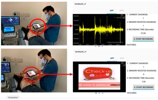 The screen design of the mobile application is seen in Figure 4. On top of the right corner of the screen, the predicted diagnosis is shown by a binary value, and a corresponding diagnosis image is prompted on the left half of the screen for describing the algorithms’ prediction by an image. When the predicted diagnosis image is slid to left, this part starts to show real-time phonocardiogram graphs. Below the predicted diagnosis display on the top right corner of the screen, recording time in seconds is displayed. Recording time is displayed according to the outputs of a counter function that is triggered by the boolean value of the start recording button located below the time display on the screen. When this button is switched on, the heart sound is also saved in the device’s memory. At the bottom right of the screen, the extracted features are displayed every five seconds.