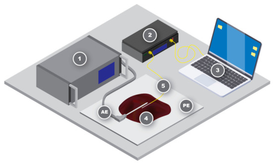 The radiofrequency ablation setup consisting of an RF (radiofrequency) generator, Micron Optics, 16-element array FBG optical fiber, and commercially purchased porcine liver is schematically depicted in Figure 1 with the photographic view of the experimental setup in Figure 2. The customized hybrid radiofrequency ablation (RFA)/Microwave ablation (MWA) generator for research purposes (LEANFA S.r.l., Ruvo di Puglia, Italy, Hybrid RFA/MWA module) coupled with the RF or MW applicator depending on the application was used as a thermal ablation source. This study employed the RF module with a radiofrequency applicator ending with the conical in shape and 0.5 cm in length with an active electrode (AE) at the tip. The dimensions of the applicator are 0.3 cm in diameter and 16 cm in length. The passive electrode (PE) is a metallic plate positioned underneath the tissue.