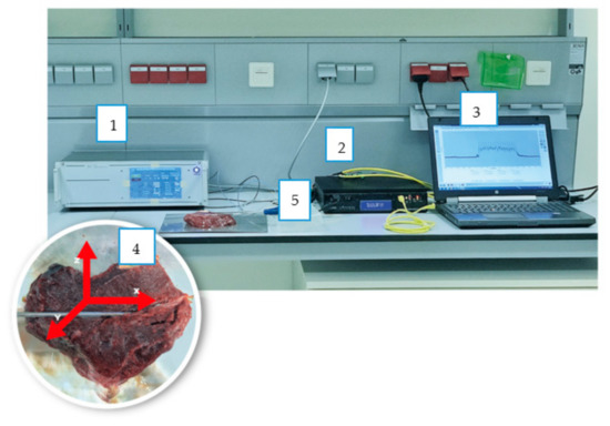 Schematic representation of the radiofrequency ablation setup of the porcine liver using a 16-element array fiber Bragg grating (FBG) temperature sensing system. The setup consisted of: (1) an RFA generator; (2) Micron Optics; (3) computer; (4) porcine liver; (5) 16-element FBG array.