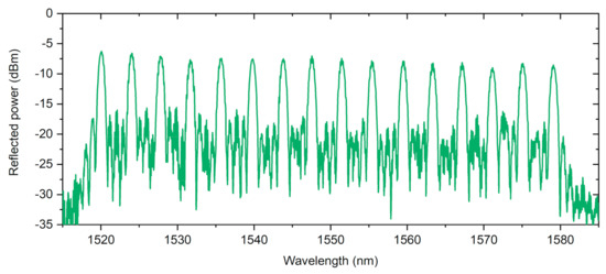 The fiber Bragg grating (FBG) array used for the thermometry was inscribed with the point-by-point technique using femtosecond laser radiation [21]. The method enables FBGs inscription through a polyimide protective coating of a fiber resulting in durability and high mechanical strength of a fabricated sensor [22]. The high degree of flexibility makes the method most suitable for writing FBGs with different resonant wavelengths and different lengths [21], with specified refractive index profile [23], and an arbitrary position in the cross-section of fiber [24]. A Fibercore SM1500 (9/125) P fiber with a 20 μm-thick polyimide protective coating was used for the fabrication of an FBG array enclosing 16 FBGs. Each FBG in the array has a length of 1 mm and a distance between adjacent FBGs of 5.000 mm, so the total (edge-to-edge) length of the FBG array was 76 mm. In order to separate FBGs in spectral-domain resonant wavelengths were distributed equidistantly in the range of 1520–1580 nm with ∆λ ≈ 4 nm (Figure 3).