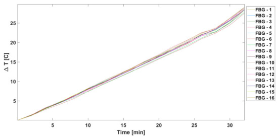 The calibration of 16-element array FBG fibers was conducted before the experiments. The spectra for each temperature from 23 to 55 °C with 2 °C increments were recorded. The shifts of wavelengths corresponding to each FBG were observed for each temperature change, which is demonstrated in Figure 4. The resulting value of constant temperature coefficient k was approximately 8.8 pm/K.