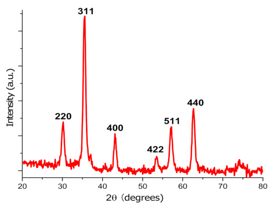 The iron oxide magnetic nanoparticles were synthesized employing the solvothermal method according to the Reference [25]. The Fe(II) and Fe(III) iron sources were weighed and placed into 50 mL beaker. The beaker containing 2.535 g of FeCl3 × H2O and 1.8625 g of FeCl2 × 4H2O followed by the addition of 6.25 mL distilled water under the magnetic stirring on a hotplate. 6.25 mL of 25% ammonium hydroxide was added slowly in the fume hood to the iron salt solution with continuous stirring at 700 rpm for 2 min. The obtained final 15 mL solution was poured into the 30 mL Teflon-lined stainless steel autoclave that was further put into the muffle furnace for 1 h heating at 180 °C. The obtained nanoparticles were washed three times using the distilled water and separated using an external SuperMag magnet. Purified iron oxide nanoparticles were dried in an oven at 40 °C to obtain the powder. Finally, the nanoparticles were characterized by using an X-Ray diffraction instrument (Figure 5) and scanning electron microscopy (Figure 6).