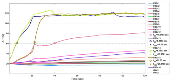 The time step between each measurement was equal to 1 millisecond. After converting the spectral shifts of each peak to thermal data, it was possible to reconstruct the temperatures of the FBGs along the length of the fiber during the heating procedure. Using these thermal values and the previously mentioned distances, the interpolation was implemented to estimate the temperatures at points between the FBGs. The resulting spatial resolution between data points was equal to 0.0001 m.