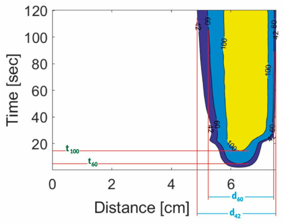 The thermal map obtained during the thermal ablation of the porcine liver when 5 mg/mL iron oxide nanoparticles dispersed in agarose were employed, where t60—time needed to reach the temperature 60 °C; t100—time needed to reach the temperature 100 °C; d42—the ablated area when the temperature reached 42 °C; and d60—the ablated area when the temperature reached 60 °C.