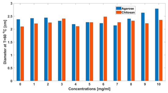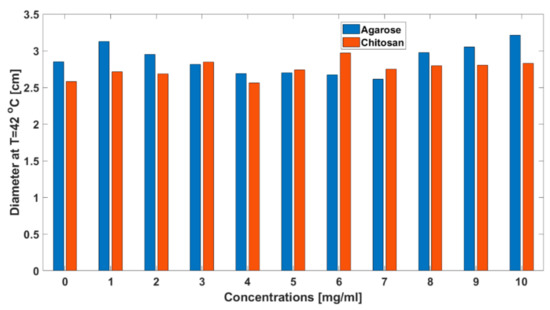 The area of tumor ablation is considered one of the main challenges during thermal ablation therapy. Figure 9 presents the values of the ablated diameters achieved at 42 °C (t42) for all 10 concentrations and both solvents. The ablation diameter achieved by iron oxide nanoparticles for chitosan and agarose solvents reached approximately 3 cm as can be seen from Figure 9.
