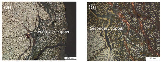 Secondary copper is a highly pure metallic Cu formed within a bronze artifact‘s microstructure. These are mostly formed between layers of corrosion materials, particularly in fractures created by external forces, defects in the casting process, holes created by corroded Pb particles, or α + δ eutectoid sites lost through corrosion. Multiple processes, such as electrolysis, generation of residual Cu particles, and rapid changes in the burial environment, can explain secondary copper formation [7]. Here, secondary copper observed in the Ga-2 bronze artifact were small particles found in cracks (Figure 2b and Figure 3b). These are common features found in ancient bronze artifacts, which can be observed when the artifacts corrode over extended periods [8].