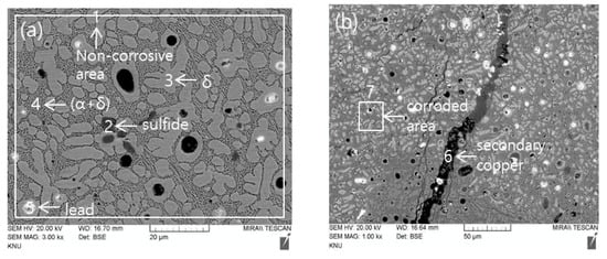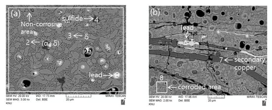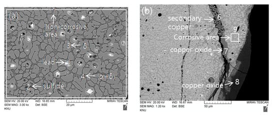 The microstructure consisted of α + δ eutectoid and δ phases with sporadic sulfide and lead particles (Figure 7a). Its secondary copper likely formed as clumps in the corroded Pb particles or cracks, and twin crystals were observed in some cases (Figure 8a). Secondary copper with twin crystals is a product of the alloy’s constituent components undergoing extended mineralization, production technique, and burial environment [14]. In addition, black corrosion products observed on the mirror’s surface during excavation appeared because mineralized cassiterite formed on the surface.