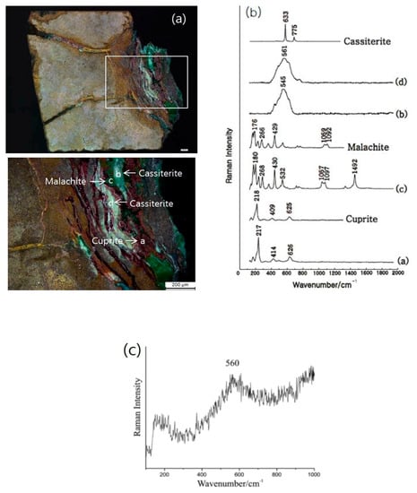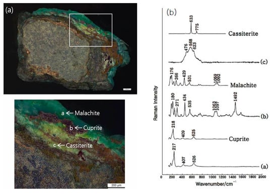 Enlarging the corrosion layers of the bronze mirror in DF photography revealed thick, localized layers of red and green corrosion products. According to the classification system proposed by Robbiola et al. [10], this falls under type II corrosion. Through micro-Raman spectroscopy, the dark green corrosion product (a) was determined as malachite ((Cu2CO3(OH)2), the red corrosion product (b) was cuprite (Cu2O), and the bright green corrosion product (c) was cassiterite (SnO2) (Figure 11a).