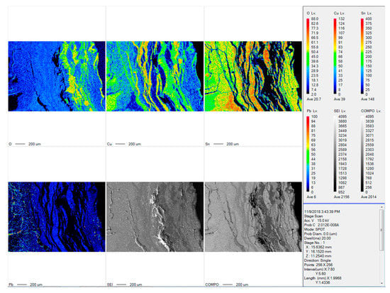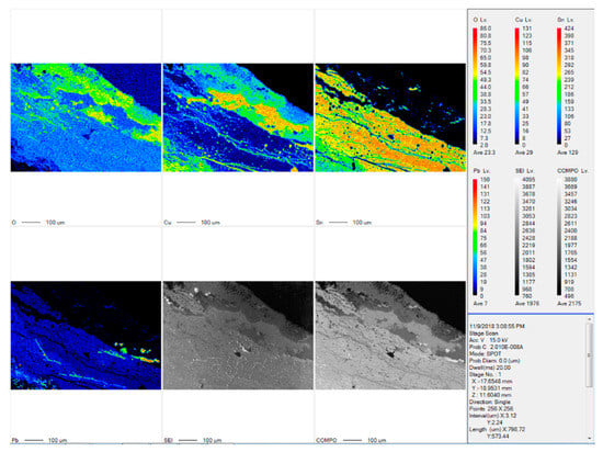 EPMA analysis found that Sn content increased significantly toward the edges’ corrosion layers, which contained SnO2 (Figure 5). Excluding highly reducing environments with low pH, SnO2 could be found in a wide zone between the PO2 = 1 and PH2 = 1 bars in a stable state, as seen in the Cu-Sn-Cl-H2O Eh-pH diagram. Moreover, the Gibbs energies of SnO2 and Cu2O are −519 kJ/mol−1 and −416 kJ/mol−1, respectively, at a temperature of 24.85 °C. These findings, along with the insolubility of SnO2, explain the high levels of Sn in the artifact’s corrosion layers [7].