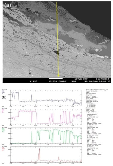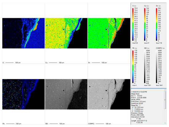 Based on the EPMA mapping analysis results (Figure 12), corrosion layers with large amounts of Sn formed in the corroded microstructure because O and Sn content was remarkably high in the sections under the corrosion layer. From the EPMA line analysis, Cu and Sn exhibit inversely proportional correlations relative to their overall positions (Figure 13). In an external environment, anions such as CO32− and O2− move to the bronze alloy’s interior, while cations of metals such as Cu and Sn move outward and bond with each other to form and maintain a corrosion layer [16].