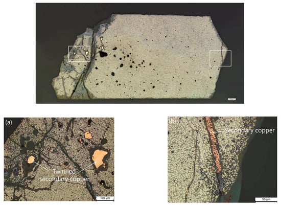 Ga-31 (No. 2) optical micrograph images showing (a) twinned secondary copper and (b) secondary copper in corrosion.