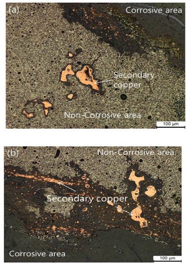 Most currently excavated bronze artifacts are corroded, showing a loss of their original surface colors and being covered with corrosion products. Prolonged burial of bronze artifacts leads to erosion, resulting in morphological changes to stable states and forming various corrosion products. Some representative bronze corrosion products found in ancient bronze artifacts include cuprite (Cu2O), tenorite (CuO), malachite (Cu2CO3(OH)2), and paratacamite (Cu2Cl(OH)3). Here, the corrosion products’ type and shape are affected by various factors, such as the artifact’s composition, manufacturing technique, size, and burial environment [1]. Furthermore, because of differing conditions, the burial environment can be inferred based on the corrosion products. However, unlike artificial corrosion tests, the corrosion characteristics of naturally corroded bronze artifacts do not appear uniformly. Therefore, data on corrosion characteristics obtained from relics with known excavation sites can play a crucial role in artifact authenticity, preservation, and long-term corrosion research.