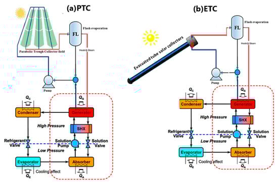 As mentioned previously, the proposed system combines two systems: a solar power system and an absorption air conditioning (AAC) system. The solar power system includes a thermal solar collector and flash tank. Basically, the plant is driven by solar energy. The current proposed absorption cooling systems (H2O-LiBr/NH3-H2O) integrated with (PTC/ETC) are displayed in Figure 1.