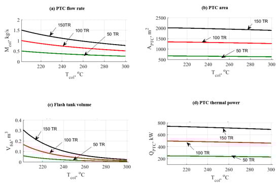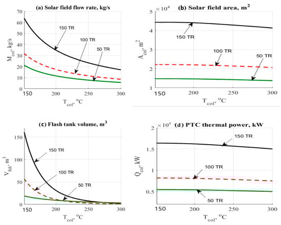 By identifying the total mass flow rate, which is estimated based on the load of the boiler heat exchanger, and assigning a hydraulic mass flow rate to be the input, the entire number of loops , area of the loop , the width of the loop , and the solar PTC’s number ( are calculated as follows:
