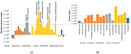 The compounds identified in the apple aroma are plotted in a logarithmic scale against its own contribution to the aroma; values higher than 1 can contribute to aroma, values higher than 1000 present an odor intensity in the supra-threshold area (blue line). The GC peak area obtained by Headspace–Solid Phase Microextraction Gas Chromatography Combined with Quadrupole Mass Spectrometry (HS–SPME/GC–qMS) was divided by the odor threshold given by the (a) Relative Aroma Index (the compounds corresponding to each bar are presented in Table 1 in the same sequence); (b) the concentration calculated by Simultaneous Distillation Extraction (SDE)/GC–qMS divided by the odor threshold given by the Aroma Index. Ethyl-2-MBT: ethyl-2-methylbutanoate.