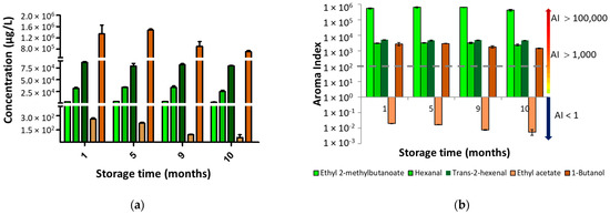 Quality assessment of key compounds monitored during apple aroma storage at room temperature, produced in January, from apples harvested in 2013. (a) Concentration in µg/L of each compound; (b) Aroma Index (AI) calculated for each compound using the odor thresholds reported in literature. The standard deviation was represented as error bars.