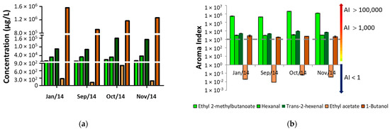 The influence of the different raw material and technological adjustments used during the production through the year was investigated in terms of fluctuations in the apple aroma quality. The apple aroma was collected in January, produced with apples stored under controlled atmospheric conditions, and September, October, and November, using apples harvested near the fruit processing date (Figure 3). The compounds that presented the higher concentration in the apple aroma from the different productions were 1-butanol, followed by trans-2-hexenal; hexanal and ethyl 2-methylbutanoate presented a similar and constant concentration over the sampling points; and ethyl acetate had the lowest concentration. Although the concentration of 1-butanol and trans-2-hexenal showed variation over the productions, no variation was observed for ethyl 2-methylbutanoate, the compound that is associated more with apple aroma scent (Figure 3a). Taking in consideration the Aroma Index values of the five compounds, which were very similar in all sampling points (Figure 3b), it can be inferred that the concentration variation should not be reflected in the odor perception of industrial apple aroma. A high fluctuation in concentration of the 1-butanol conferred only a slight difference in its Aroma Index.