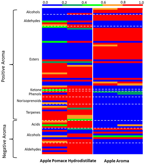 The following are available online at https://www.mdpi.com/2076-3417/11/5/2443/s1, Table S1: GC peak area of apple hydrodistillate obtained from the wet apple pomace and apple aroma resulting from industrial juice processing, analyzed by HS–SPME/GC–MS, and divided into positive and negative aroma and chemical families according to the heatmap of Figure 4.