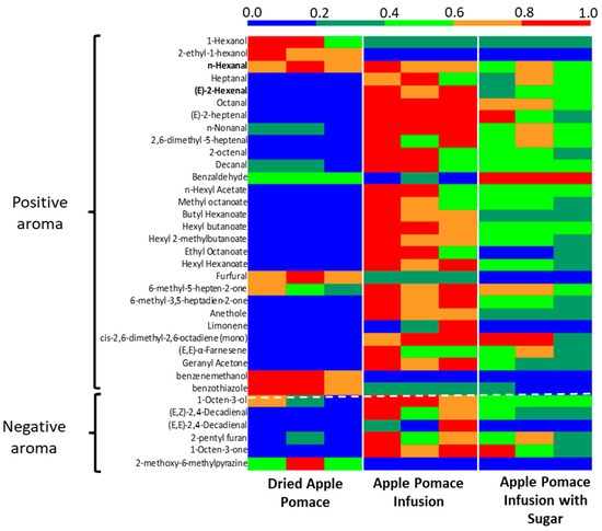 Heatmap of the volatile composition of the dried apple pomace at 80 °C and infusions obtained with dried apple pomace (from January 2014 production) without and with sugar addition. Columns correspond to triplicates of each sample analyzed by HS–SPME/GC–MS. The GC peak area intensity is represented in a blue to red scale normalized between the minimum to maximum areas for each compound.