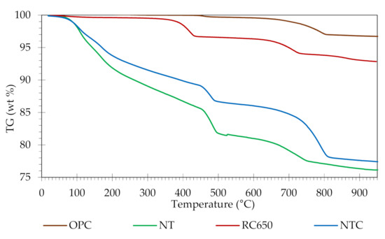 Thermogravimetric analysis of OPC, recycled cement paste (RCP), non-treated cement paste (NT) and non-treated concrete cement paste (NTC).