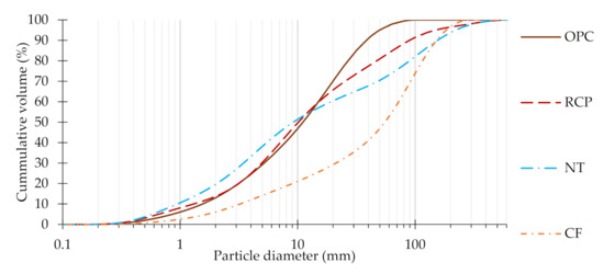 For comparison purposes, non-treated waste cement paste (NT), sieved at 250 μm, and waste concrete filler (CF), sieved at 150 μm, were also considered as nearly inert additions. The CF was obtained from the above mentioned method of waste concrete separation, corresponding to the fine fraction below 150 µm, that could not be processed. The properties of these materials are presented in Table 2. As shown in Figure 3, RCP was produced with slightly coarser particle size distribution than OPC, especially over 10 µm. Moreover, the RCC presented about 50% less surface area than RCP, due to the contamination of non-porous natural aggregate (Table 2). The particle size distribution of CF was markedly coarser and less extensive than the other selected materials. Finally, a polycarboxylate based superplasticizer (SP) was also adopted in mixtures with a low w/b (0.35) or high water requirement.