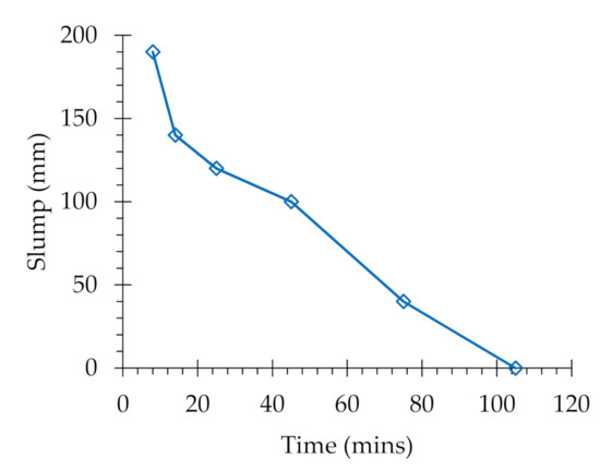 Figure 4 displays the workability over time of 15P65. Contrary to what is usually observed in OPC mixtures, a quick workability reduction occurred during the first 15 min, due to the exothermic hydration of free CaO, as well as the RCP absorption [9,14,22]. This loss of workability is expected to increase with the incorporation percentage of RCP. Then, up to 45 min, the slump was less altered. The fresh concrete faces an induction period, as shown by isothermal calorimetry analysis conducted by the authors [9,10] and also documented in the literature [8,19,41]. After 45 min, the workability gradually decreased, due to the progressive hydration and setting of the binder.