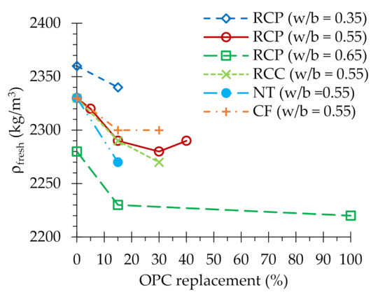 Fresh density, ρfresh, of concrete with different replacement percentages of OPC with RCP, RCC, NT and CF.