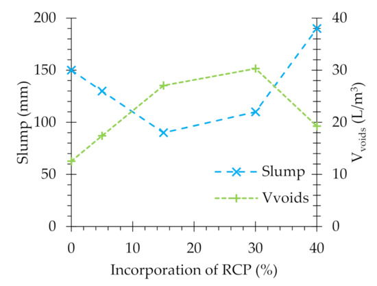 Slump and volume of voids, Vvoids, as a function of the incorporation percentage of RCP in concrete with a w/b of 0.55.