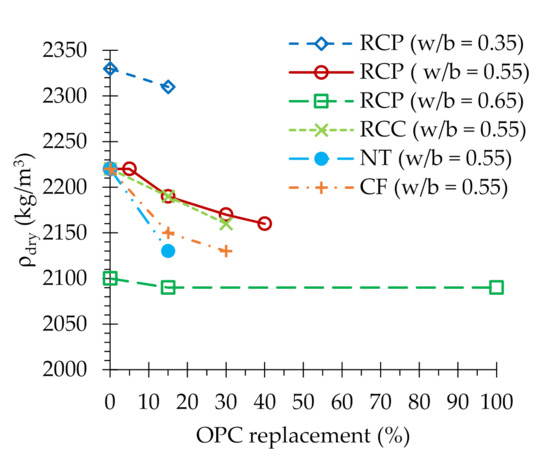 In general, the reduction of dry density as a function of the incorporation of RCP followed the same trend of fresh density. Similarly, the dry density was more affected by the w/b than by the amount of RCP (Figure 7). For the same w/b, the dry density only decreased up to 2.7% with the incorporation of RCP. Moreover, the average difference between the fresh and dry density was similar in RCP and OPC concrete of equal w/b (Table 4). This suggests that RCP and OPC tended to bind similar amount of hydration water.