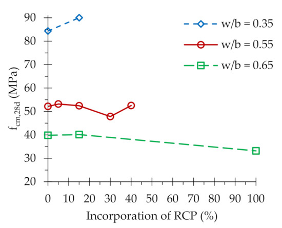 Compressive strength at 28 days, fcm,28d, of concrete with different incorporation percentages of RCP and w/b.