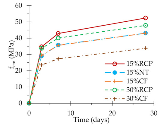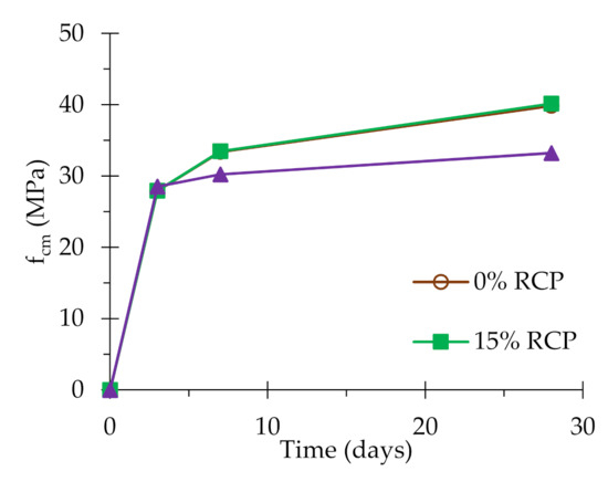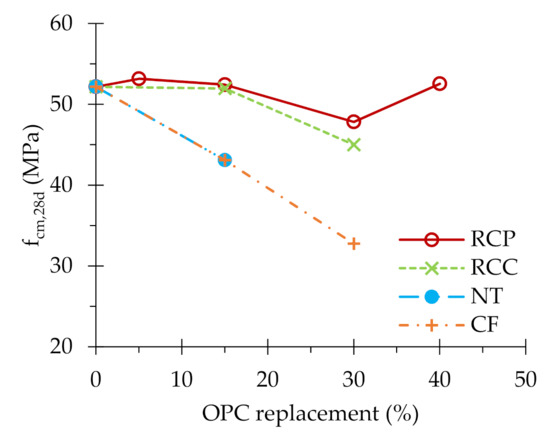 In spite of the aggregate contamination of RCC and the consequent reduction of the cementitious fraction, the compressive strength was not significantly different from that of RCP concrete of similar composition, especially up to 15% replacement (Figure 9). Actually, taking into account that the cementitious fraction is 74% by weight of RCC (Section 2.1), the respective w/cf is about 0.57 and 0.60 for concrete with 15% and 30% RCC, respectively. Therefore, up to 15% replacement, the filler and nucleation effect of RCC should have compensated the slight increase in w/cf. However, for 30% replacement, the higher w/cf assumed more relevance in the compressive strength reduction.