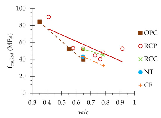 Figure 8 shows the compressive strength at 28 days of concretes with different w/b as a function of the incorporation percentage of RCP. Depending on the incorporation percentage of RCP and w/b, the compressive strength varied between 33.2 and 90 MPa at 28 days. These concretes ranged strength classes from C20/25 to C70/85, according to EN 206 [31], making them suitable for the production of common structural concrete.