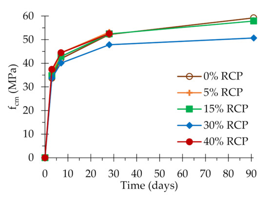 However, the incorporation of more than 15%RCP tended to decrease the compressive strength. This may be attributed to the diluted effect of the OPC amount, as well as the reduction of the workability and consequent compactness of concrete with high incorporation percentage of RCP. As documented by Real et al. [9] in a previous study with an equal recycled cement thermoactivated at 650 °C, the compressive strength at 28 days of RCP pastes was about 28% lower than that of OPC pastes of equal w/b, displaying less long-term development of outer hydration products than OPC. In fact, part of the mixing water is rapidly consumed in the hydration of internal products within the porous structure of recycled cement particles [10].