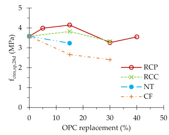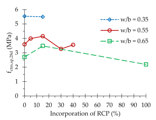 Tensile splitting strength at 28 days, fctm,sp,28d, of concrete with different incorporation percentages of RCP and w/b.