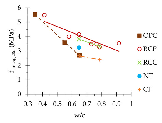 Comparing mixtures with the same workability and without SP, the tensile splitting strength was only 3% higher in concrete with OPC (w/b of 0.55) than with 15%RCP (w/b of 0.62) (Table 4). A similar reduction was found for concrete with 30% RCC (w/cf of 0.60). This indicates that the tensile splitting strength was less affected by the w/b than the compressive strength, which corroborates the well-known lower proportional increase in the tensile splitting strength with the compressive strength [42,43]. Similarly to the compressive strength, the NT and CF did not significantly contribute to the tensile splitting strength (Figure 16). As mentioned, the incorporation of these admixtures decreases the overall amount of hydration products. In fact, considering the tensile splitting strength at 28 days as a function of the w/c (Figure 17), the contribution of NT and CF to this property was not significant.