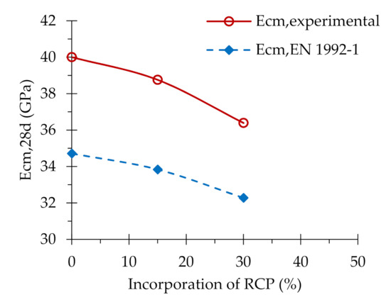 Modulus of elasticity at 28 days, Ecm,28d, of concrete with w/b of 0.55 and different percentages of RCP at 28 days and estimated through EN 1992-1 [42].
