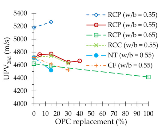 The UPV of concrete is essentially affected by its density and stiffness, which are both related to the microstructure porosity. For this reason, the UPV as a function the incorporation of RCP showed a similar evolution to that found for the compressive strength (Section 3.2).