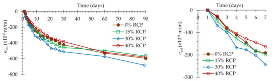 The 30%RCP concrete developed a less dense microstructure (Section 3.3) and stiffness was further reduced (Section 3.5). Moreover, the RCP concretes tended to have slightly higher volumes of paste than the reference OPC concrete. Therefore, in this case, the drying shrinkage increased about 15% at 90 days.