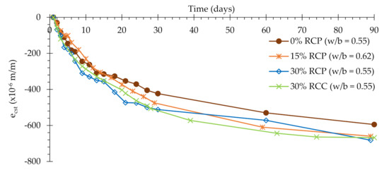 As expected, for the same workability, the long-term drying shrinkage of 15% RCP concrete (w/b of 0.62) was slightly higher than that of reference concrete with OPC (Figure 24). In this case, the higher w/b of the RCP concrete reduced the aggregate/paste ratio and increased the amount of evaporable water, as well as the microstructure porosity. Therefore, the source of shrinkage was increased and the restraining action promoted by the aggregate skeleton and paste microstructure was reduced [46].