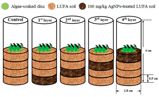 Four contamination configurations of heterogenous soils were prepared in vials, as described in Figure 2: control, 1st, 2nd, 3rd, and 4th layer-treated groups. Two grams of AgNP-free soil was put in a glass vial (height 40 mm, diameter 18 mm) and saturated with an aliquot of autoclaved deionized water. This process was repeated four times to obtain a final 8 g of soil with 90% of the maximum water holding capacity in each vial. The AgNP-free soil was then substituted with 100 mg AgNPs/kg dry weight soil for each exposure scenario. According to the modified method reported in Nam et al. [12,20], we dipped a disc made of pure cellulose fibers (diameter 10 mm, thickness 1.1 mm; Advantec, KS, USA) into the algal suspension and then placed it in each vial, pressing it adhered to the soil surface. At the beginning of the experiment, the vials were incubated for six days under the same conditions as those used to sub-culture the algae, except that the vials were not shaken. After three weeks, 0.3 mL of deionized water was added to each vial and the disc containing the algal suspension was placed on top of the latter. Once again, the vials were incubated for six days under the same conditions as those used to sub-culture the algae, except the vials were not shaken. The process was repeated after 3, 6, 9, 12, 15, 18, and 21 weeks. The entire experiment lasted approximately six months and was performed with six vials per exposure scenario to obtain three replicates. The first three vials were used to analyze biomass and cell morphology; the others were used to analyze esterase activity, oxidative stress, and membrane permeability.